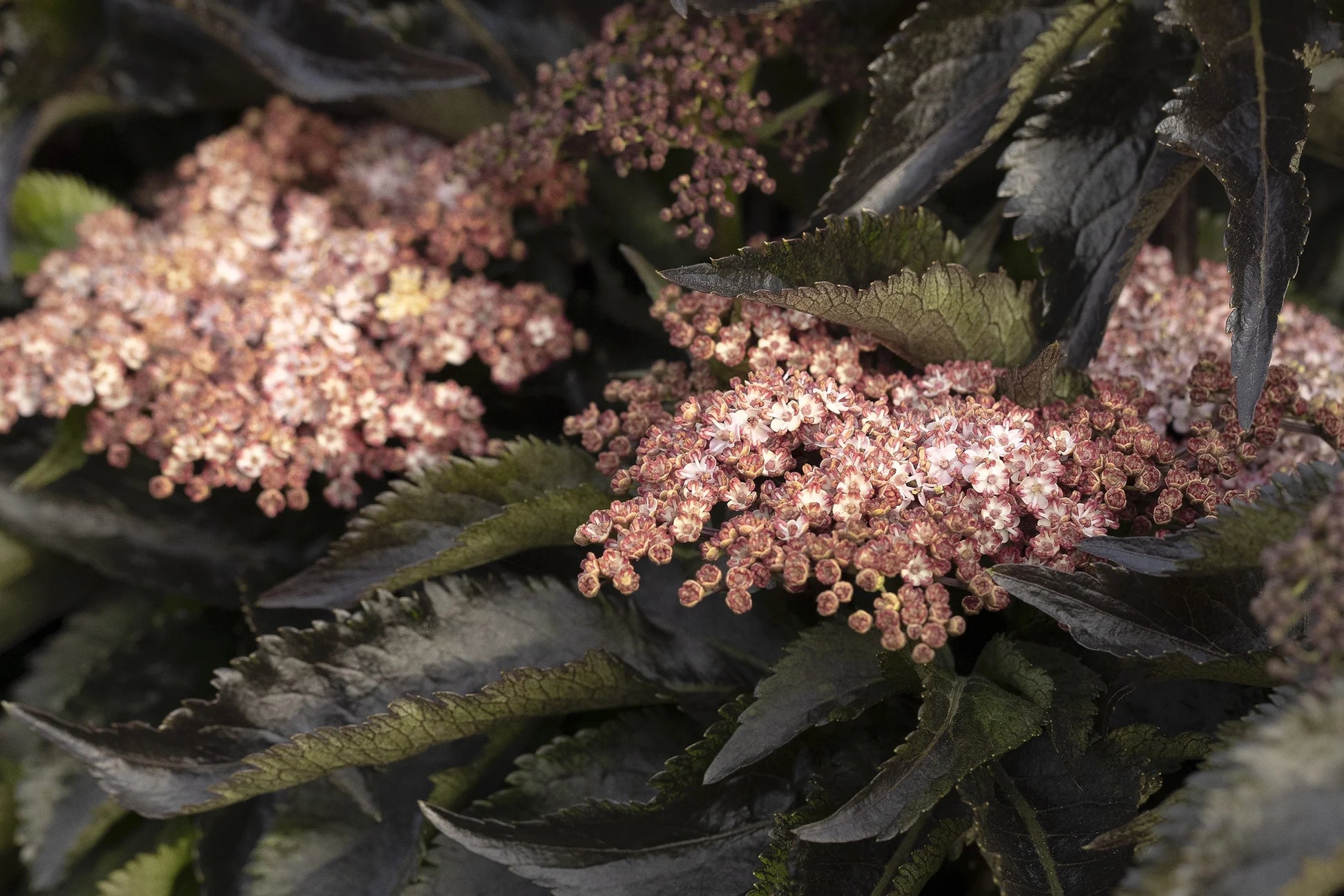 'Black Tower' Elderberry is a unique architectural plant, growing to a commanding height of 6 feet tall while maintaining a remarkably narrow, upright habit of 3 feet wide. This makes it an ideal choice for adding vertical interest to smaller spaces, creating an edgy privacy screen, or acting as a striking specimen plant. In early summer, it produces clusters of delicate, lacy pink flowers that beautifully complement its dark foliage, providing a soft touch to its bold appearance. These flowers mature into attractive, black berries in late summer, which are highly attractive to birds and can even be used for culinary purposes if desired. This adaptable shrub thrives in full sun to partial shade and is remarkably deer resistant and very tolerant of various soil conditions once established.