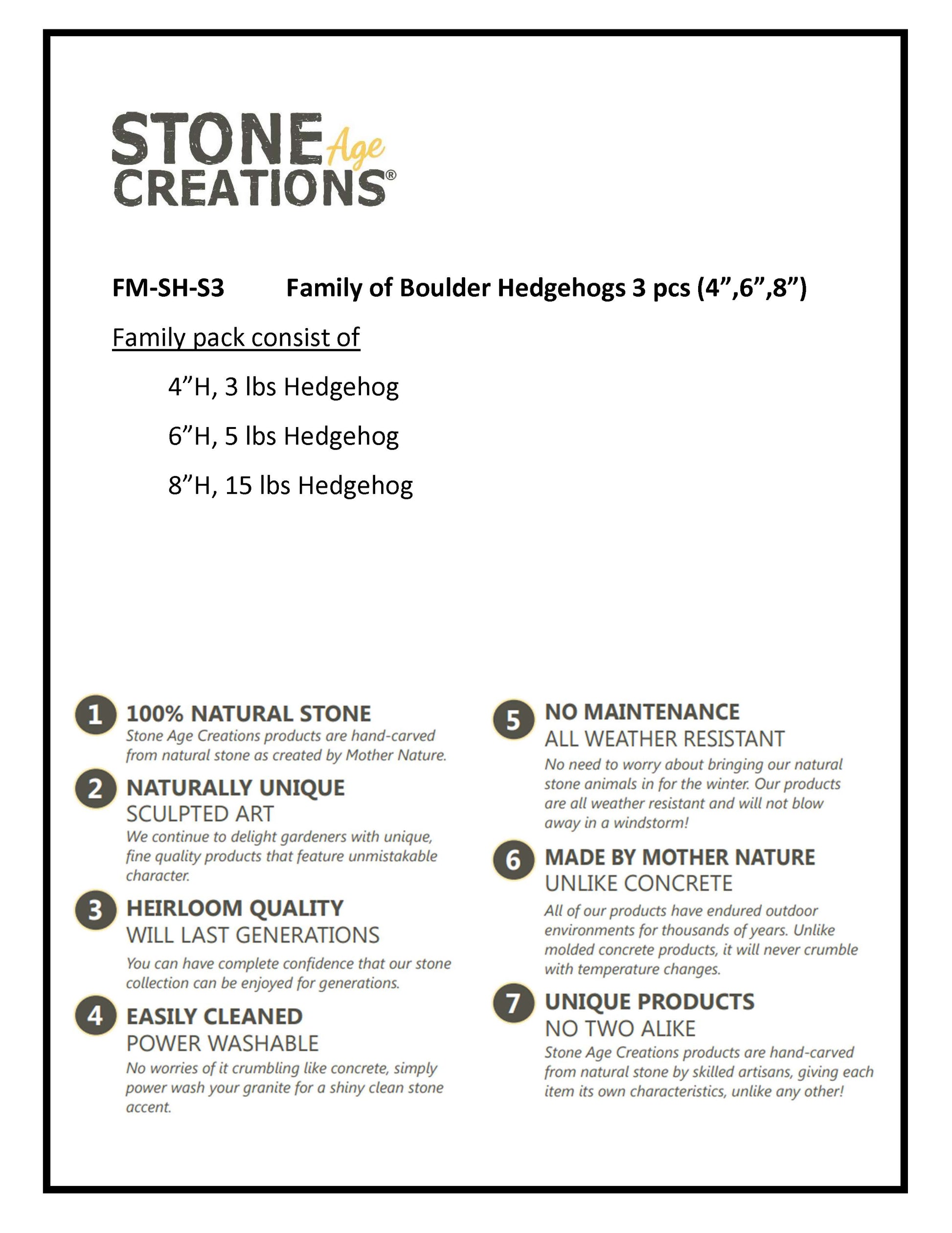 Every boulder pet is a one-of-a-kind masterpiece, with hand-carved accents and polished ears that highlight its individual shape and color variations. This 3-piece set includes a 4" 1-2 lb, 6" 3-4 lb & and 8" 15-17 lb Boulder Hedgehog. Height and weight are approximate.