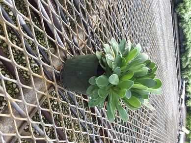 A low mound or tuft of leathery olive-green leaves, bearing upright branching sprays of tiny papery mauve-blue flowers.