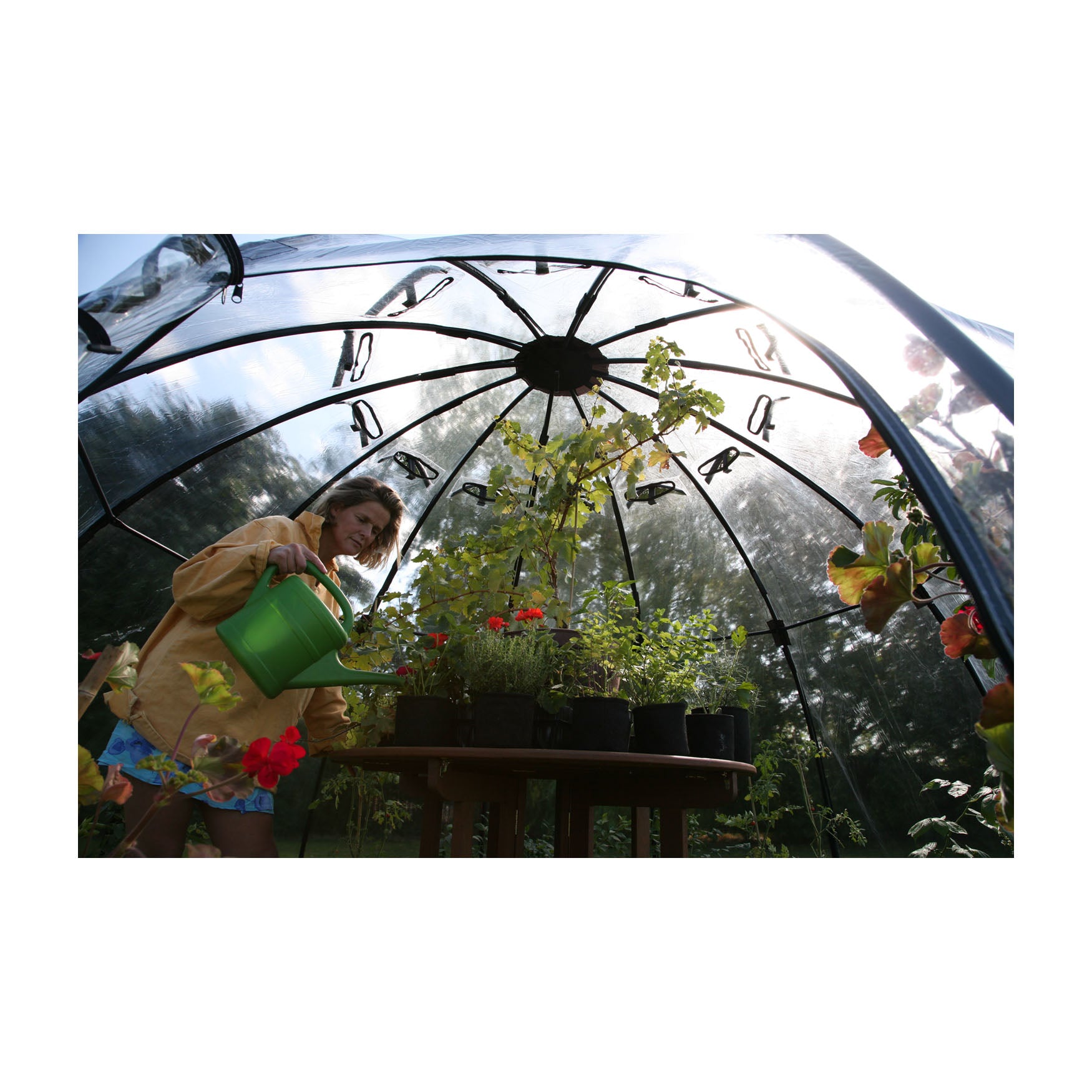 Grow crazy or just grow lazy with the exciting new Sun bubble from Haxnicks! An instant plant house/conservatory that is easy to use easy to move and easy to store. Made from UV stabilized PVC and flexible fiberglass rods Sun bubble can be quickly and easily put up and with its patented one-piece folding design can be just as easily packed away into its sturdy storage bag. Create your mini Eden project - Sun bubble warms up quicker than a traditional greenhouse and its curved shape means that the surface stays at 90 Degree to the direction of the sun all day long achieving minimum reflection and maximum penetration of light meaning that your plants' growth will be boosted. The innovative dome shape provides ample room for plants and greenhouse staging. The large Sun bubble features 12 adjustable vents to allow you to adjust the temperature to optimize growing conditions and a strong zipped doorway to keep nosy pets at bay. 11ft 6in diameter 7ft 3in high. Other uses: when it is too chilly to relax outside Sun bubble makes the ideal shelter from which to enjoy your garden. Perfect for a sunny breakfast or a candlelit dinner an outdoor playroom or simply a spot for a Sunday snooze- you choose! Also ideal for warming the kiddie pool! Sunbubble comes in two sizes standard and large. For nearly 20 years the Haxnicks company has been designing and manufacturing innovative garden care and plant protection products for their customers in England. Tierra Garden is proud to offer this distinctive line in the United States. Product: 137.8"D x 86.6"H 52lbs. Pack: 11.8"W x 11.8"D x 59"H. Pack Size: 1