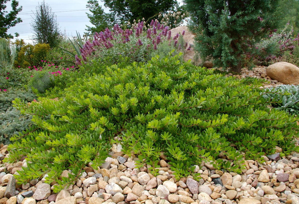 Embrace the rugged beauty of the Southwest with the Panchito Manzanita! This charming evergreen shrub offers year-round appeal with its smooth, mahogany-red bark and delicate, gray-green foliage. In late winter to early spring, it's adorned with clusters of small, urn-shaped, light pink to white flowers that are a favorite of hummingbirds. Typically growing to a manageable 2-4 feet tall and 3-5 feet wide, it's an excellent choice for water-wise gardens, rock gardens, or as an interesting groundcover. Panchito Manzanita thrives in full sun and is well-adapted to the drier conditions of our Arizona climate, making it naturally quite deer resistant. For the best establishment and to further conserve precious water, plant with Watters Premium Mulch to help retain soil moisture and suppress weeds. While this native beauty is quite self-sufficient once established, a spring feeding with 7-4-4 All-Purpose Plant Food can give it an extra boost of nutrients for healthy growth and vibrant flowering. Bring a touch of the Arizona landscape to your yard with this resilient and attractive shrub! #ArizonaNativePlant #WaterWiseGardening #DeerResistantShrub #WattersMulchMagic #LowMaintenancePlants