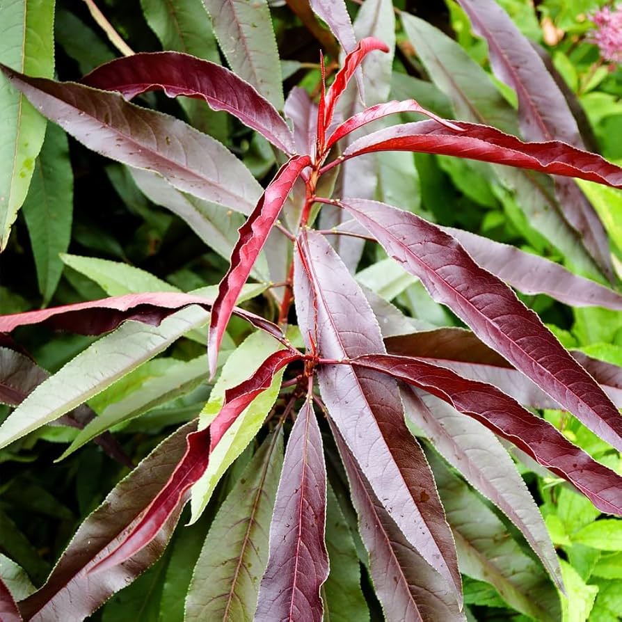 The Dwarf Bonfire Peach is a delightful addition to any garden, especially if you're keen on edible landscaping. This little peach tree offers a profusion of vibrant, deep burgundy leaves that hold their color all season long, strikingly contrasting to the usual green. It's like having a colorful, ornamental shrub that also gifts you with delicious fruit.